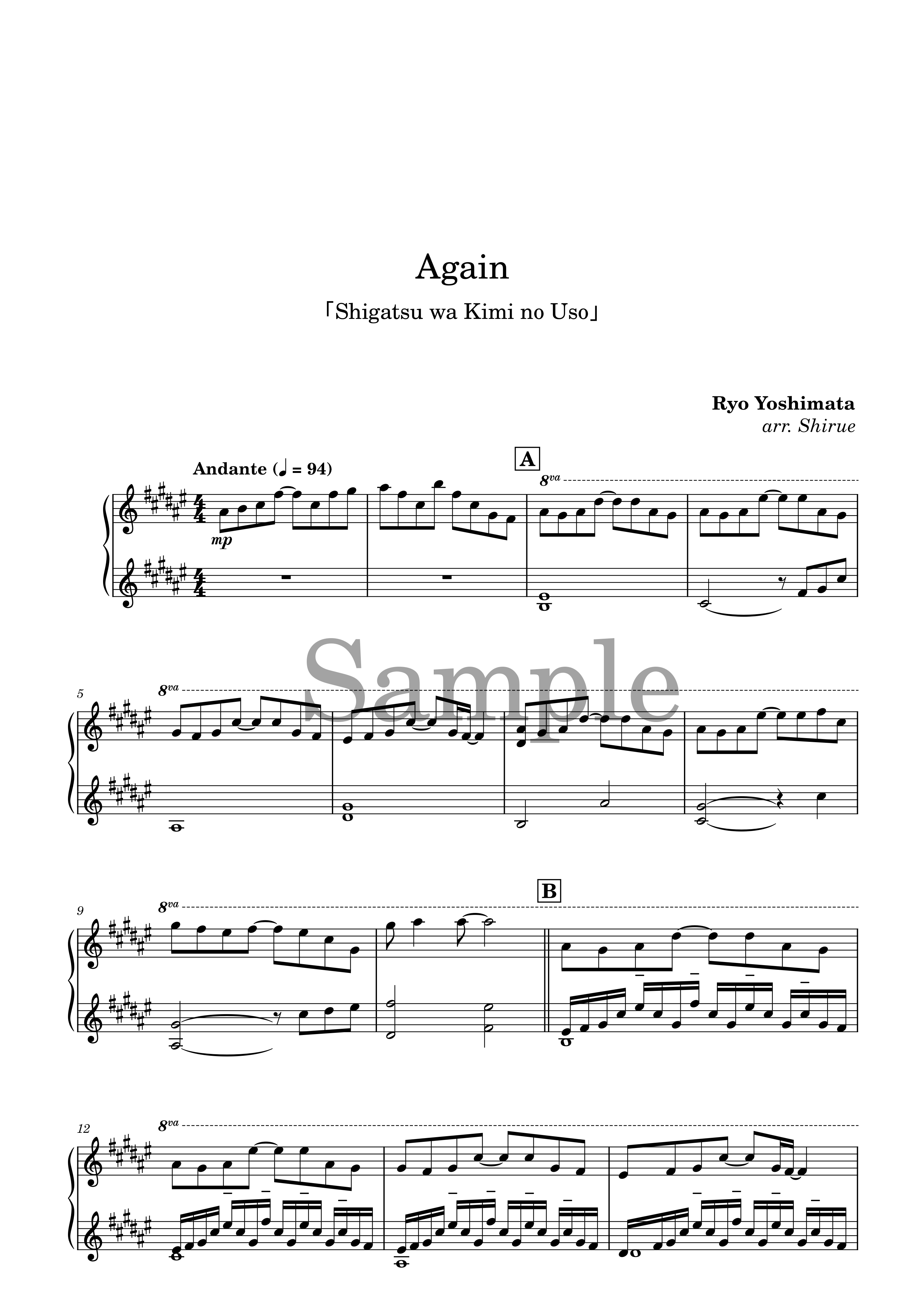Again is used as a piece of insert music for the anime your lie in april. Sheet music piano again (your lie in april) piano by masaru yokoyama and pdf file was posted here to support you to practice. Q = 94 ø ø 5 ø ø ø ø ø p 9 ø ø ø 12 ø ø v.s. Play.