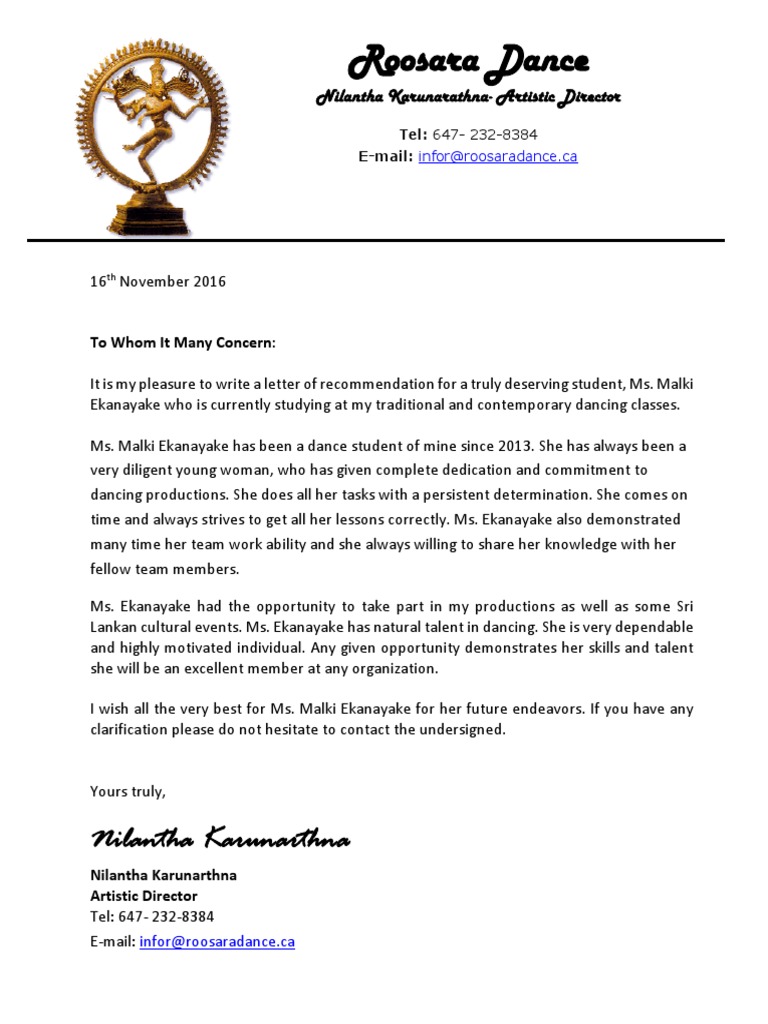 Dance Recommendation Letter Template - It is my pleasure to write a letter of recommendation for a truly deserving student. This letter of recommendation will be incomplete without acknowledging mallory’s keen sense of.