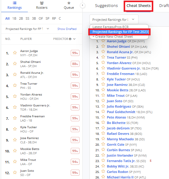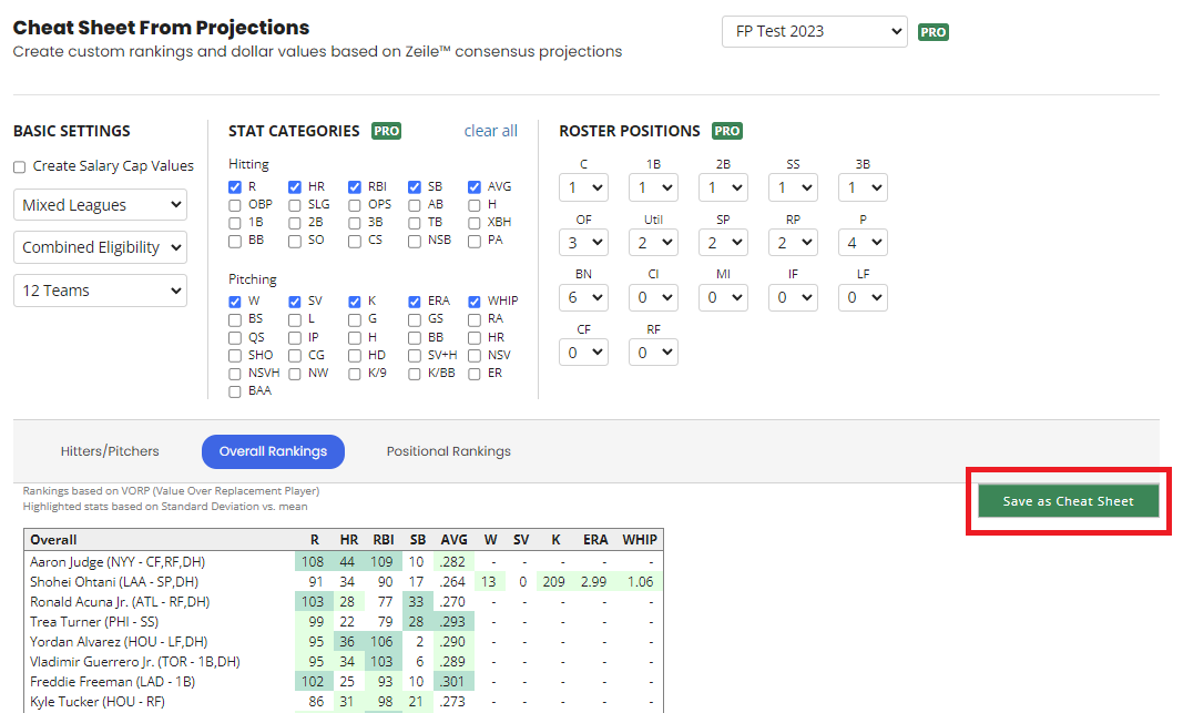 Can I create and use a custom cheat sheet for my points league? (MLB