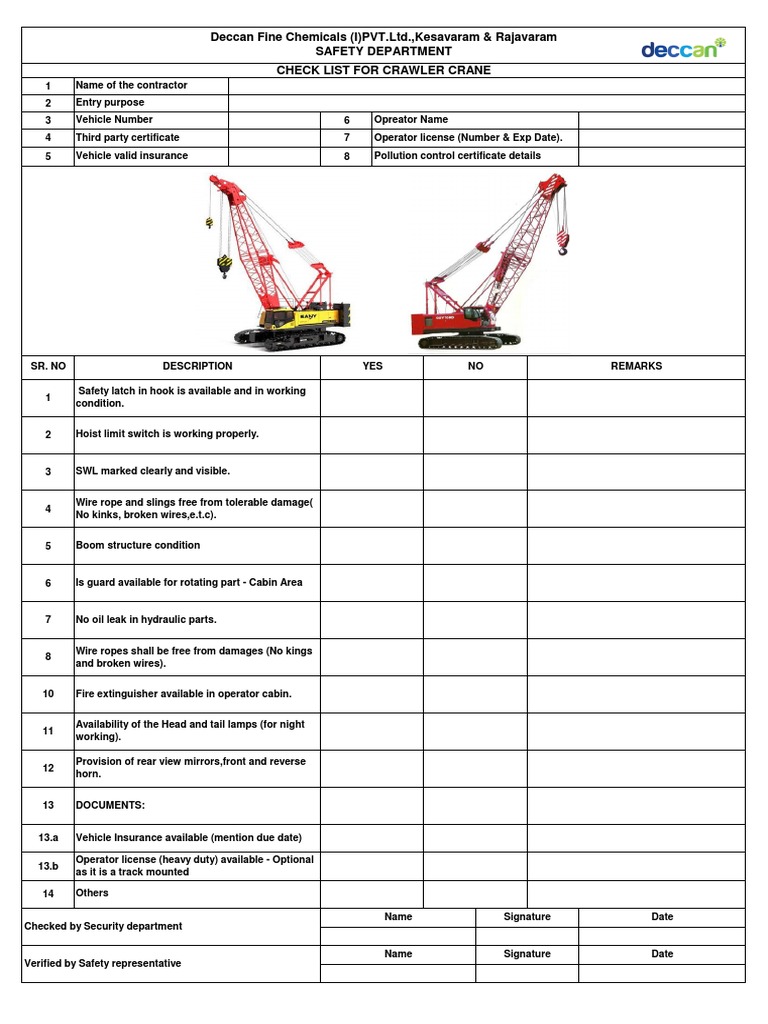 Prior to initial use, all new and altered cranes should be inspected to determine if any safety. Please initial each day of use. Overhead crane and hoist inspection checklist this file provides a comprehensive checklist. Turn completed form in to supervisor at the end of each week.