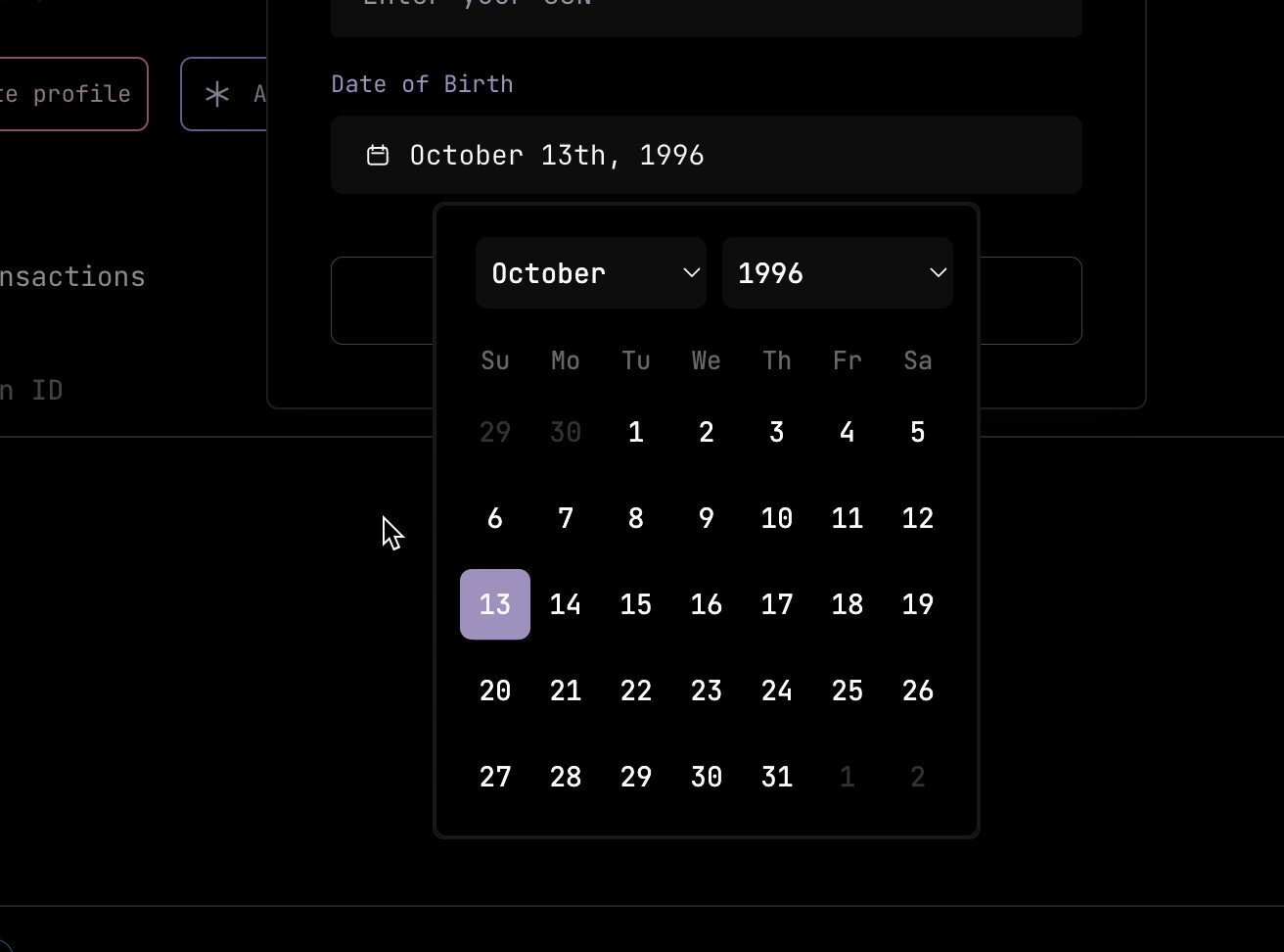 A date field component that allows users to enter and edit date. This is a fully functional calendar built with the popular shadcn/ui component library. Features dark mode, multiple views, and event. It provides various view modes (day, week, month, year),. The calendar component is built on top of react daypicker.