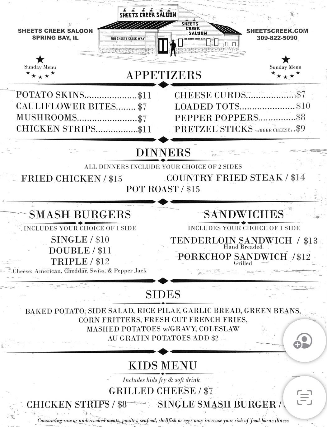 View The Menu For Sheets Creek Saloon In Spring Bay, Il.