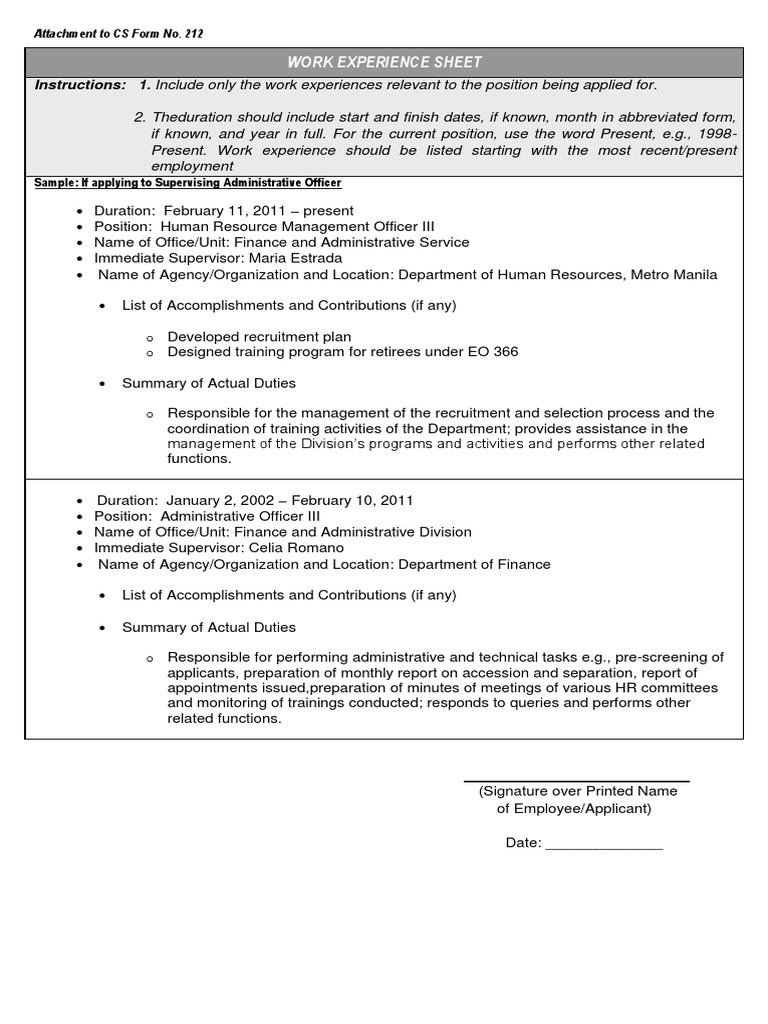 The duration should include start and finish dates, if known, month in. When you apply for a government job, one of the first documents you’ll need is the csc work experience sheet. Download the editable file here. Guide to filling up the personal data sheet. Work experience sheet is one of the attachment to the personal data sheet (cs form.